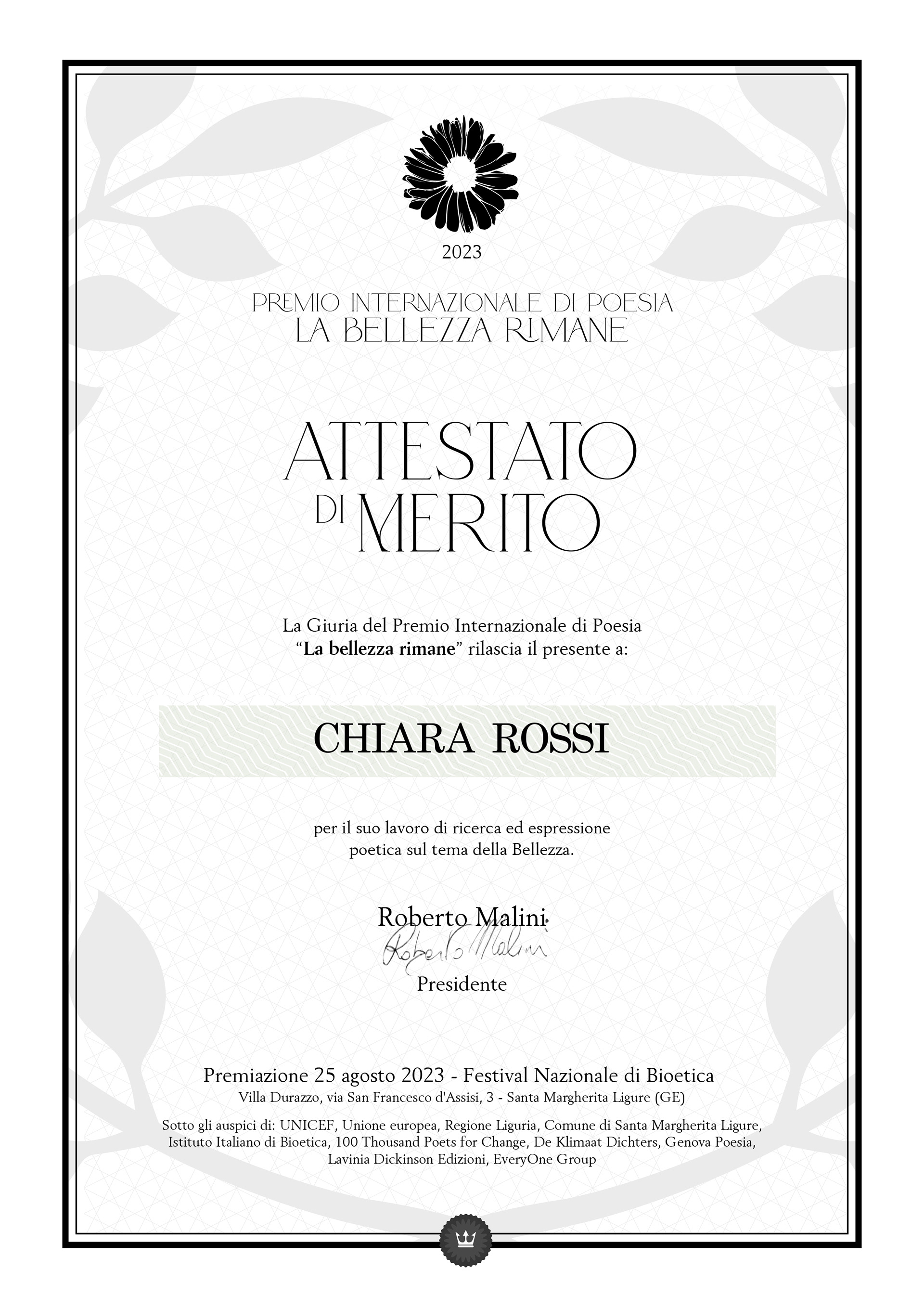 [2023]_Reincanta Bellezza, suite di tre liriche, attestato di merito, Premio internazionale di poesia «La bellezza rimane», Poeti della Lettera, 100 Thousand Poets for Change, Klimaat Dichters,